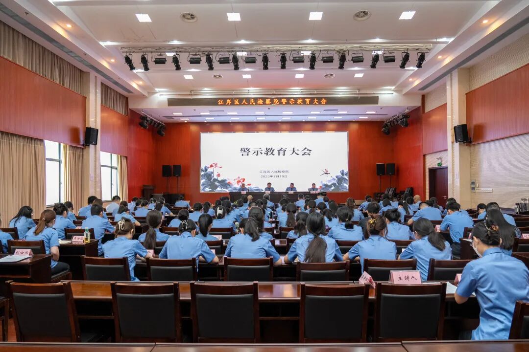 区检察院召开机关警示教育大会,内容包括宣读《江岸区人民检察院2023年党风廉政建设宣传教育月活动方案》、开展廉政党课、观看警示教育片《镜鉴家风》《异化的情感》《剑指顽疾 砸局破圈》。全体干警表示通过此次活动受到深刻警示警醒,将从案例中吸取教训、深刻反思,见微知著、防微杜渐。