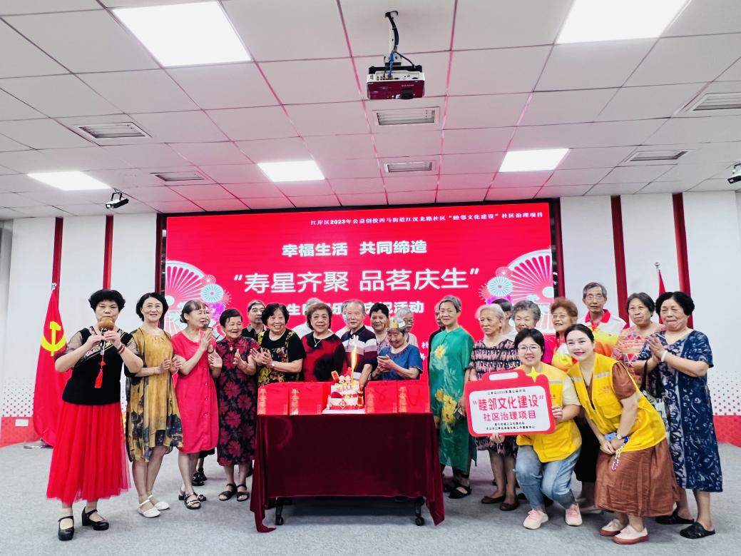西马街道江汉北路社区联合辖区“睦邻文化建设”社区治理项目佳益社工、街道社工站、“中华慈善总会 五社联动 志愿加油站”项目组、湖北中和堂文化创意有限公司共同开展“寿星齐聚 品茗庆生”生日同乐会庆祝活动,进一步营造尊老、爱老、敬老、孝老的良好氛围,让老年人感受到社区大家庭的温暖和关怀,增进晚年幸福感与社区归属感。