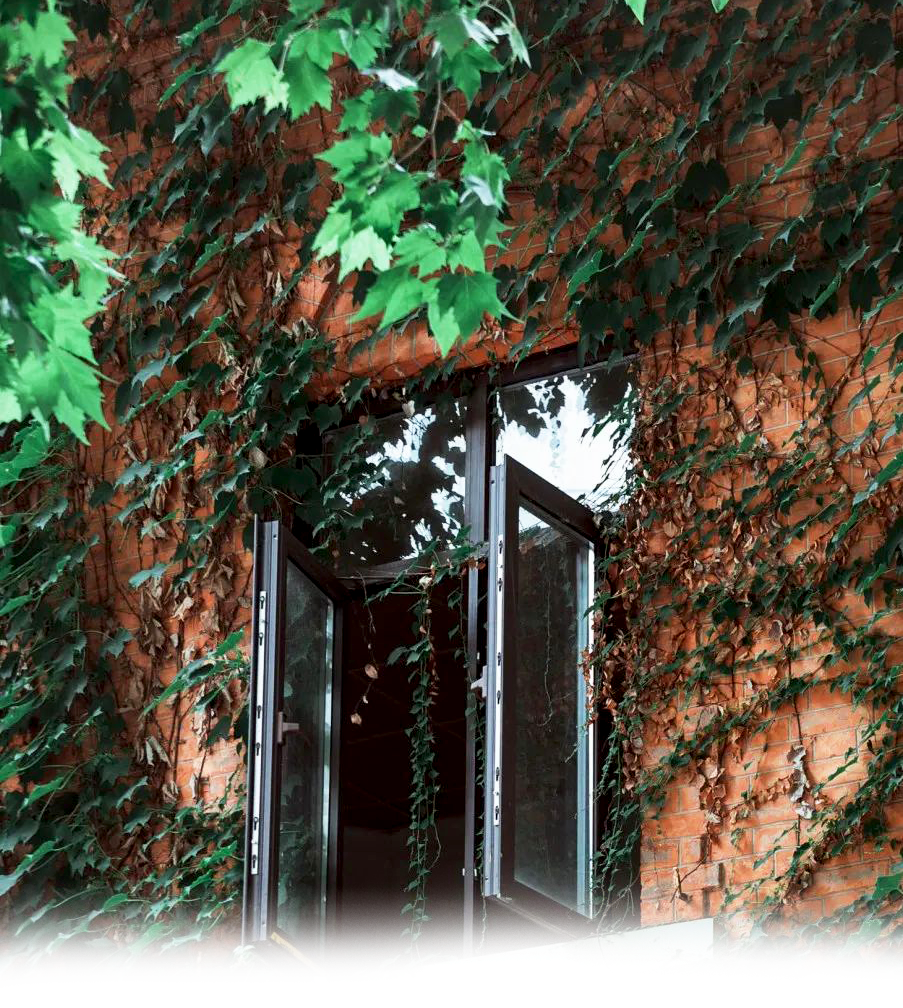 爬山虎顺着红砖绿瓦攀到屋檐,又自在地垂下脚尖,依着风懒懒地晃着。