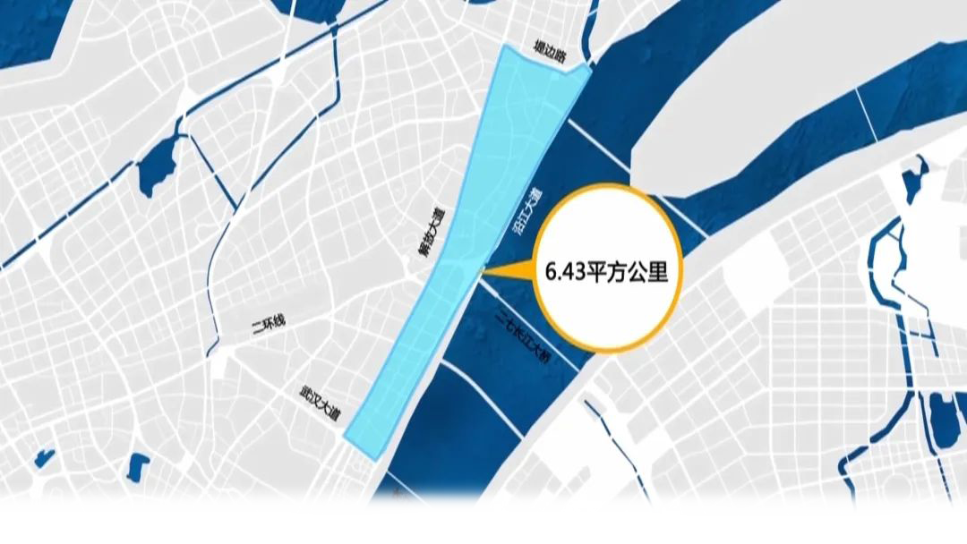 按照规划,汉口滨江国际商务区,位于长江二桥以北滨江区域,东临沿江大道,西至解放大道,南起长江二桥,北至堤边路,总用地面积6.43平方公里。