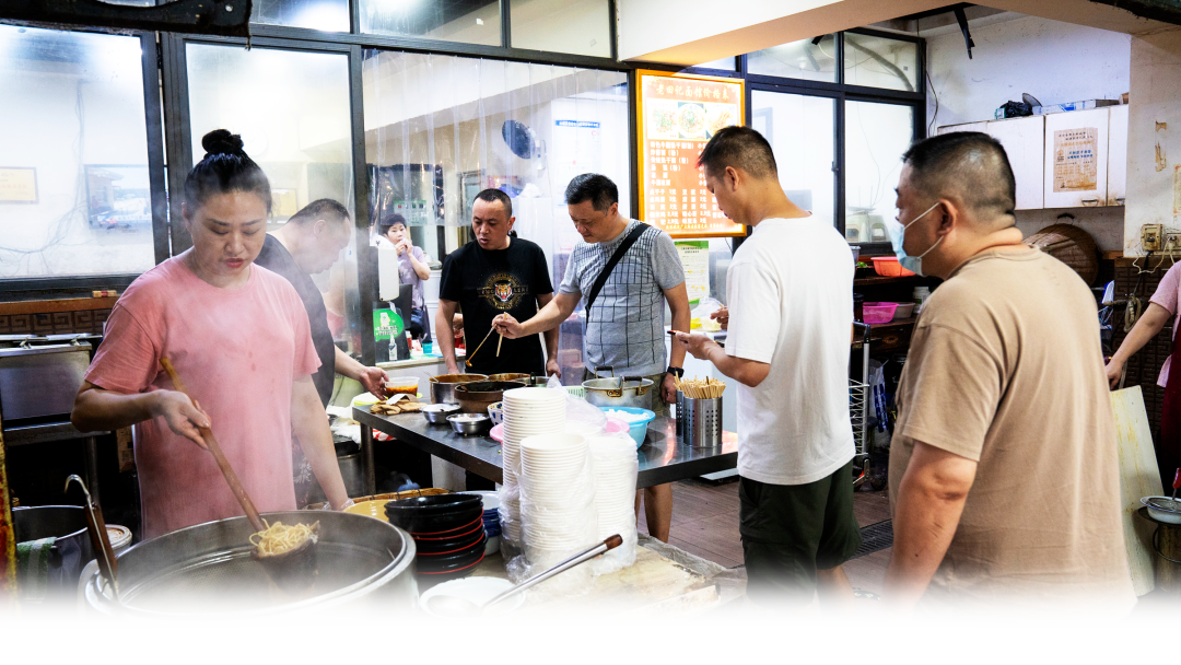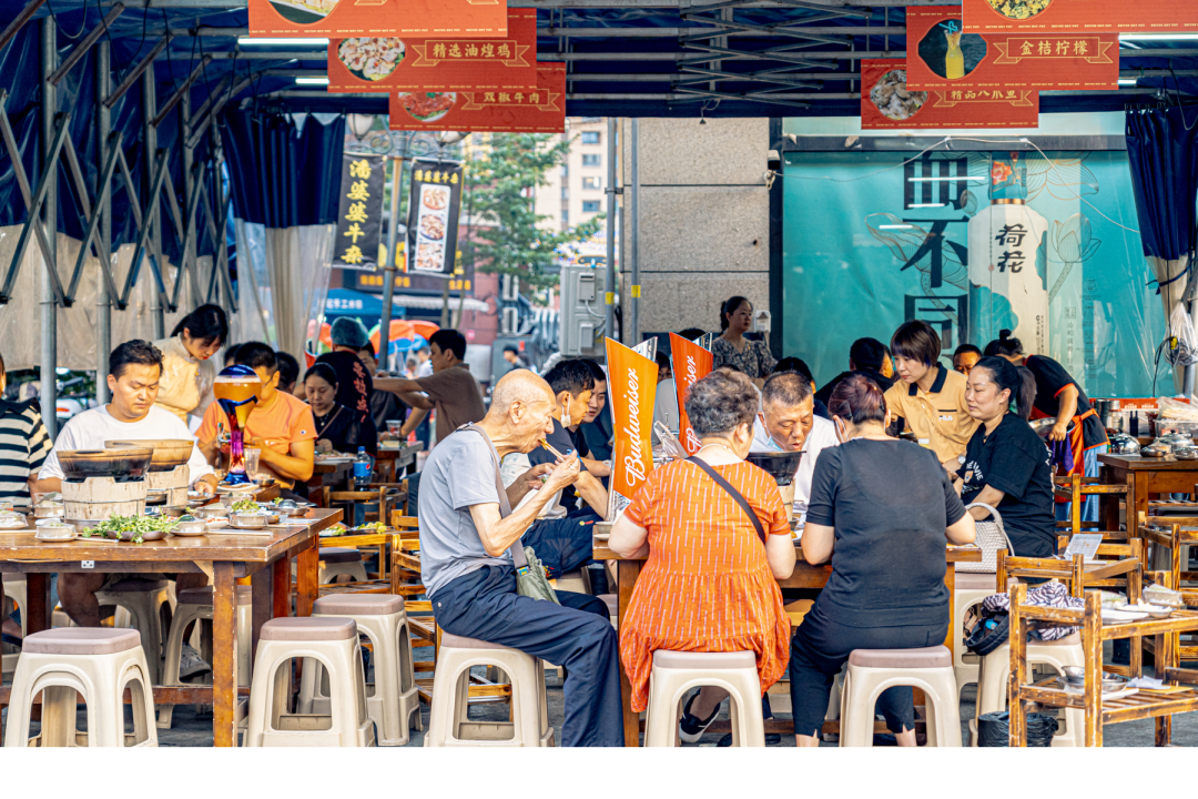 晚8时,一楼特色美食街区依旧有不少市民在餐饮门店前排队等位,期待打卡汉味美食。晚10点开始,户外大排档也随之热闹起来,陆续有年轻人结伴而来,小龙虾、毛豆、凉面、卤菜纷纷上桌,炒菜、火锅、串串也接踵而至。