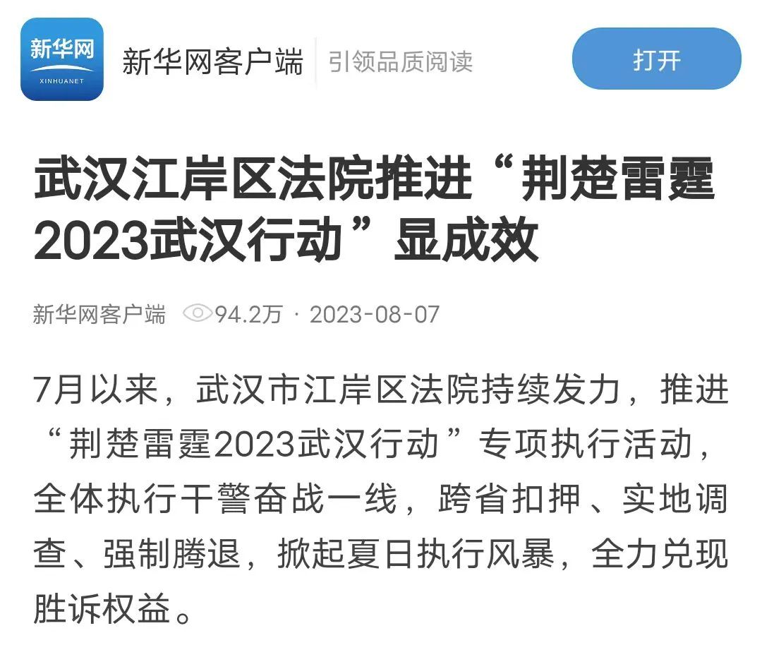 近日,新华网报道江岸区法院自7月以来,持续发力推进“荆楚雷霆2023武汉行动”专项执行活动,全体执行干警奋战一线,跨省扣押、实地调查、强制腾退,掀起夏日执行风暴,全力兑现胜诉权益。阅读量近百万,全文如下: