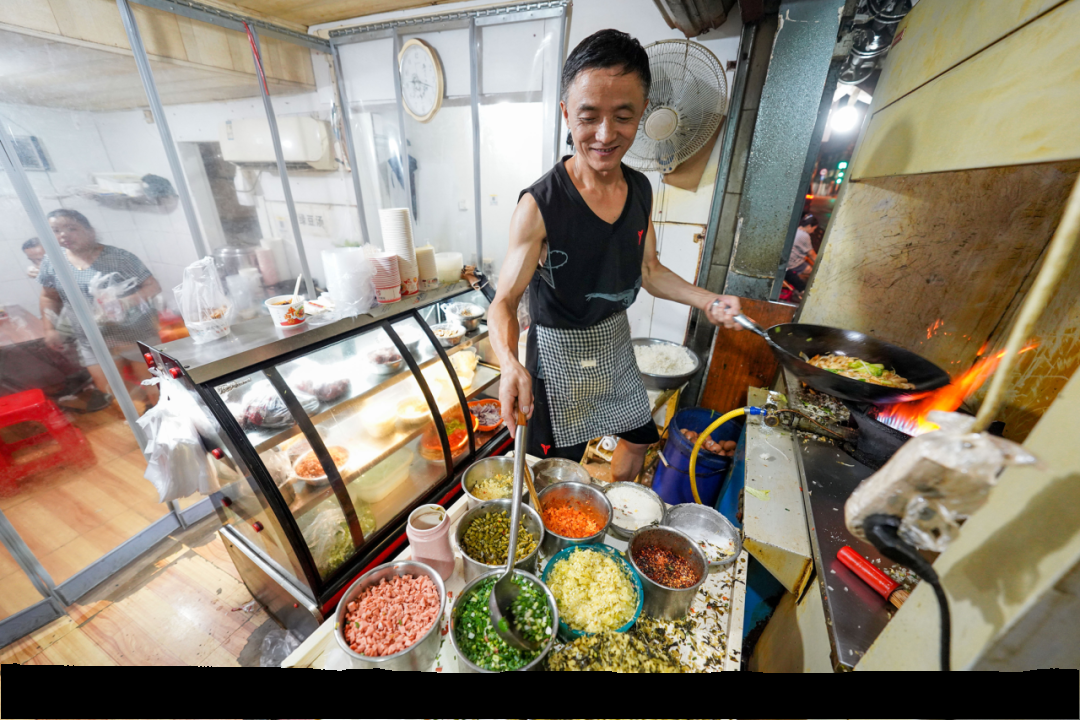 铁锅烧到炽热,透明的色拉油呈一条明亮晶莹的线条状注入锅里,“刺啦”一声后,发出沁人心脾的香味,打蛋、倒入米饭、加各种配菜……小雷手握锅铲,颠勺挑锅力道均匀地翻炒着米饭,不一会,一份热腾腾的炒饭新鲜出炉。