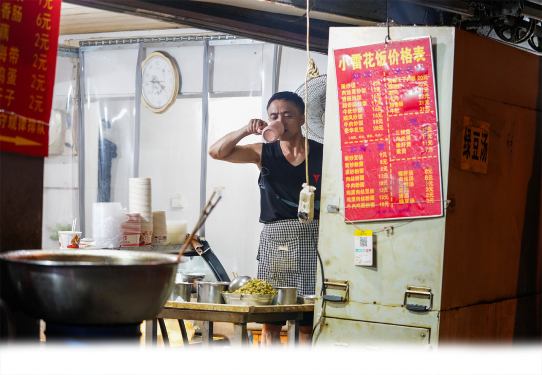 “累,并快乐着!”从下午5时营业至凌晨1时,即使不做外卖,在高峰期,店里来往的食客也络绎不绝。直到晚上10时,连续劳作炒饭五个小时的小雷才有空停下来歇息。