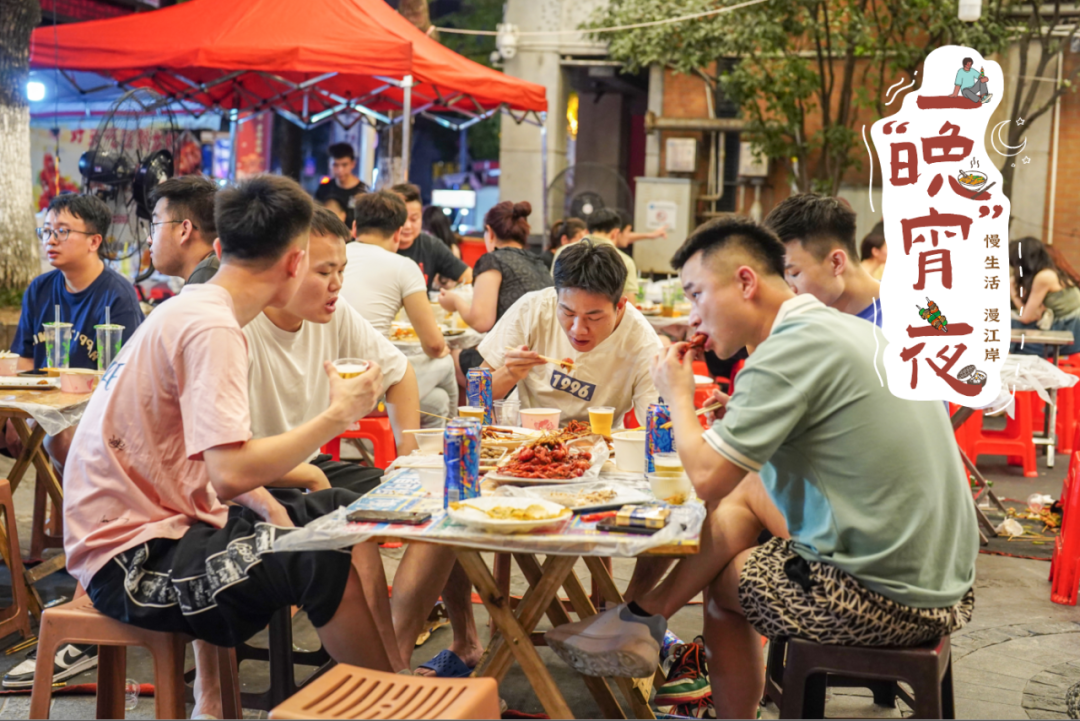 把两个小折叠桌拖着拼在一起,再拿几个红色的塑料板凳围放着,宵夜“小据点”就成了。烤架里冒起来的火苗,小吃摊上飘过来的香味,啤酒里上升的气泡,身旁朋友的笑声,让夜晚显得格外的美好。