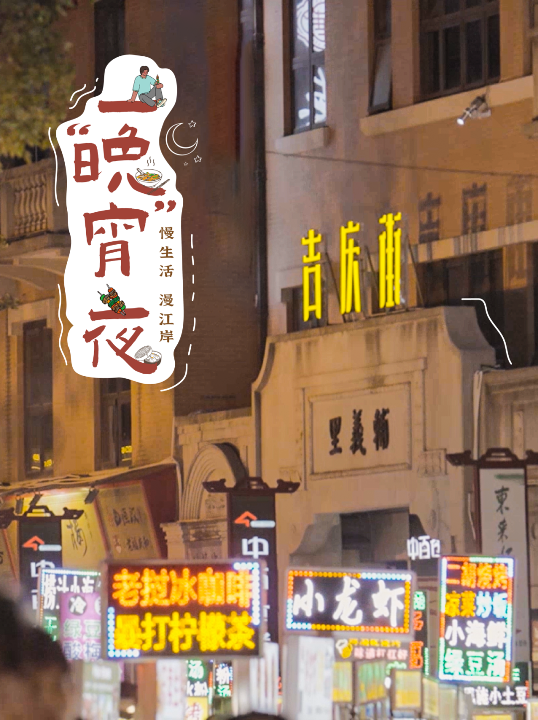 夜色微微垂下时,街边的宵夜摊子已经支起。吉庆街的夜是由摊子上的霓虹灯点亮。