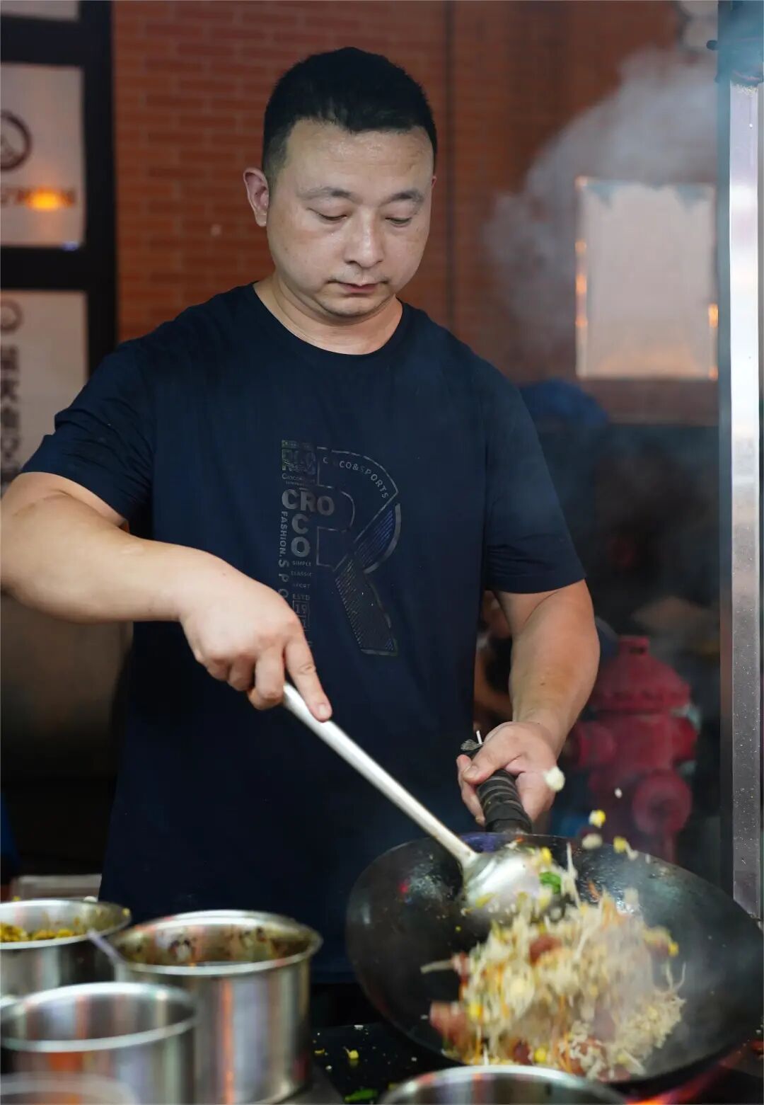 拿着绿豆汤,跟着川流不息的人群缓步前进。这边炒饭摊位的老板面前“火冒三丈”,那边烤冷面的大爷把铁板敲得噔噔直响,路边喝酒聊天的三五食客不时传来的嬉闹声,夹杂着街边小吃店的叫卖声。