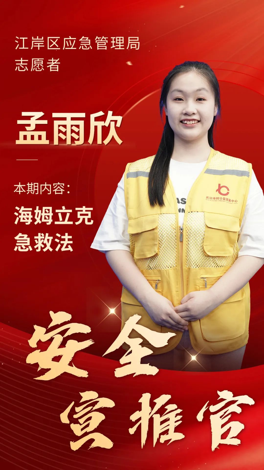 本期“安全宣推官”孟雨欣:江岸区应急管理局志愿者,武汉市2023应急科普宣讲比赛三等奖获得者。2021年高中毕业后在武汉博创公益发展中心带领下参与江岸区抗疫志愿服务,2022年初参与武汉市应急管理局组织的“应急安全社区行”项目,通过考核成为应急科普小分队首批应急科普讲师。以江岸区应急管理局、武汉博创公益发展中心联合开展的“红领巾小小应急宣传员”带队老师身份配合开展各类青少年应急安全培训活动。