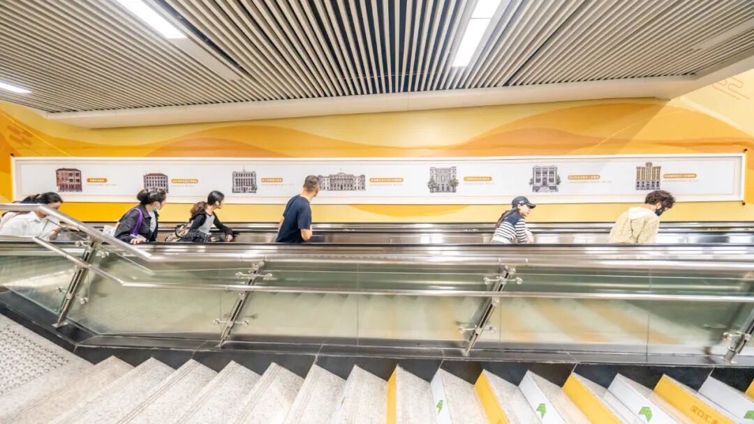 在通往地铁口的两旁扶梯通道上,一组插画卷轴徐徐展开,呈现插画家何思寻描绘的汉口历史建筑。
