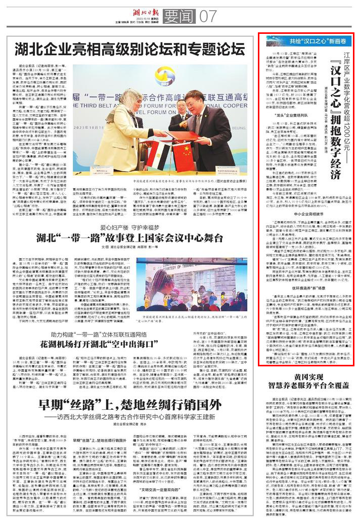 10月19日,《湖北日报》要闻版报道江岸乘“数”而上,做大数字经济“成长产业”,“龙头”企业集结列队,中小企业竞相拔节,加速“数字江岸”破茧成蝶。全文如下: