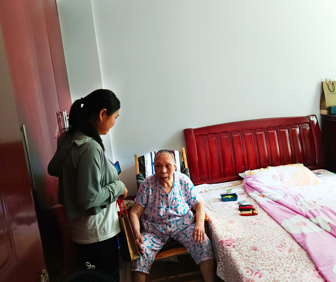 ▶ 黄桂英老人(右)偶尔会把上门看望她的黑泥湖社区网格员当成袁杰。