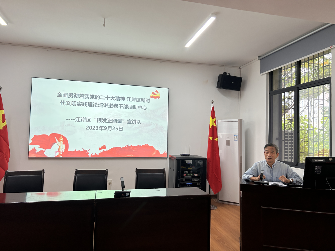 区委老干部局“银发正能量”宣讲队深入江岸区老干部活动中心,开展新时代文明实践理论宣讲,江岸区市场开发服务中心原主任兼党总支副书记薛贤桂围绕学习贯彻习近平新时代中国特色社会主义思想和党的二十大精神,以“强化政治引领,争创六好支部”为题作宣讲。区商务局退休支部全体成员及部分区直单位老干支部书记、委员70余人现场聆听。