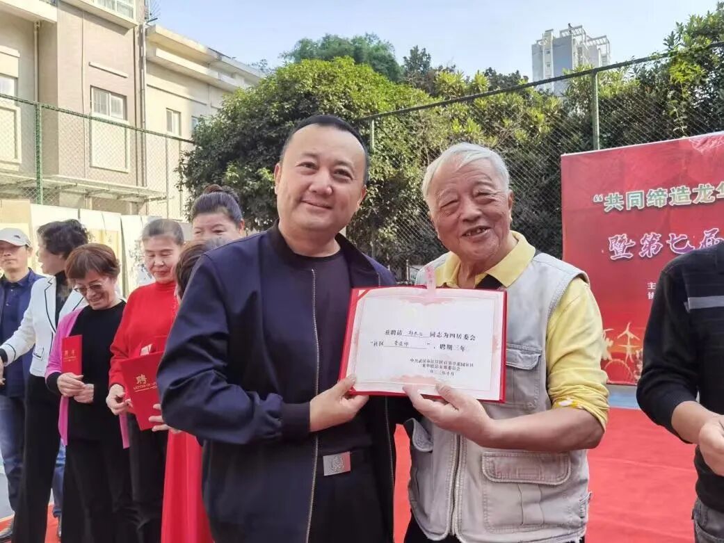 百步亭社区四居委会联合武汉市生态环境保护综合执法支队、百步亭社区派出所、百步亭社区司法所、江岸区红雁社会工作服务中心、辖区爱心商户共同举办“共同缔造龙华雅 携手共建幸福家”暨第七届“金秋艺术节”活动,现场为十余位社区主理人颁发聘书,他们当中有为辖区党员群众宣传红色精神的政工师、规划设计苑区环境的营造师、为居民生命财产巡逻护航的安全师、悉心呵护居民健康身体的健康师等。