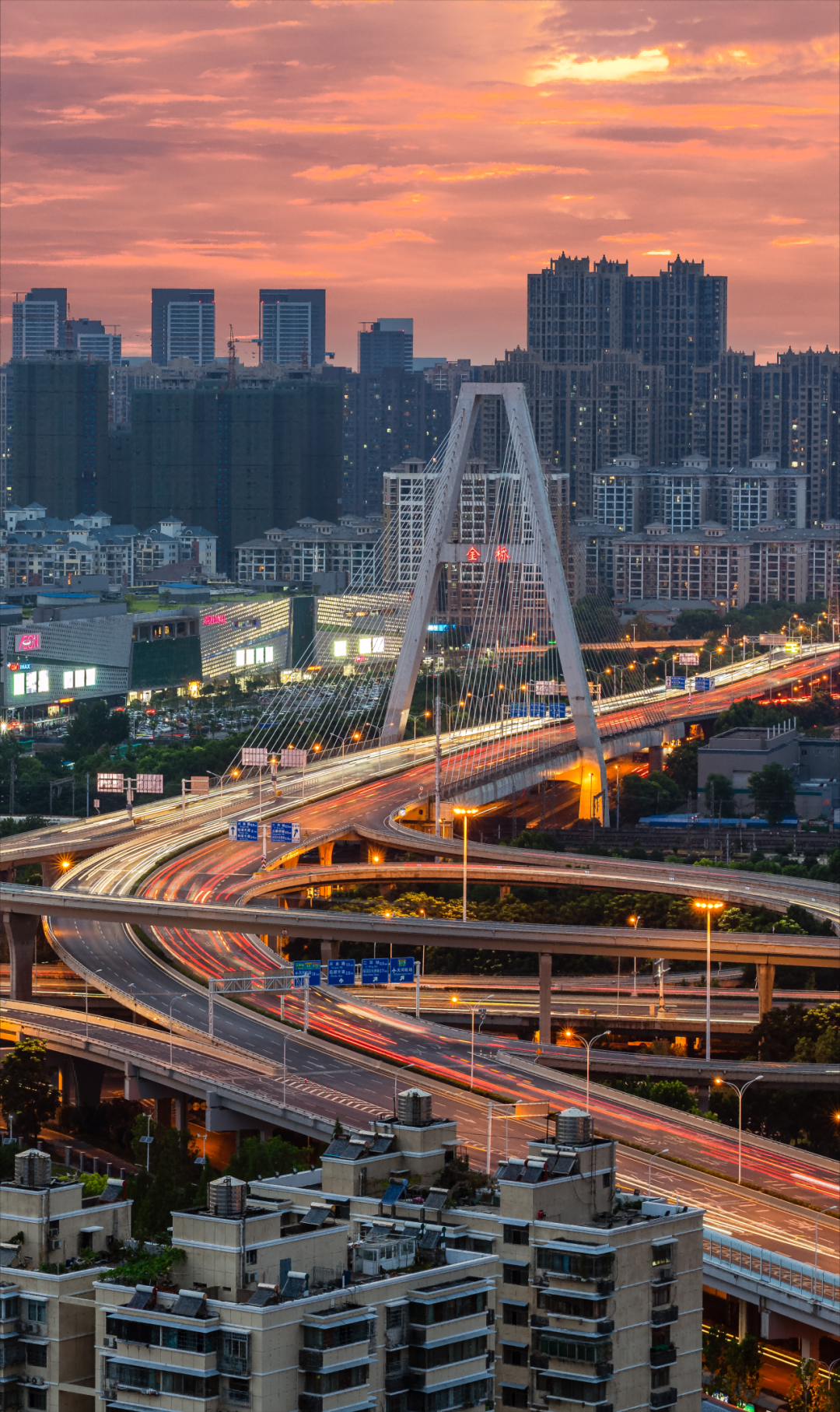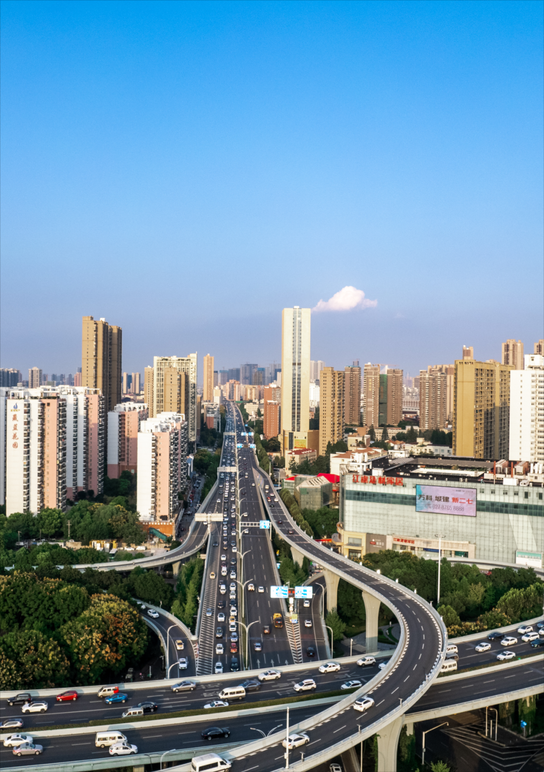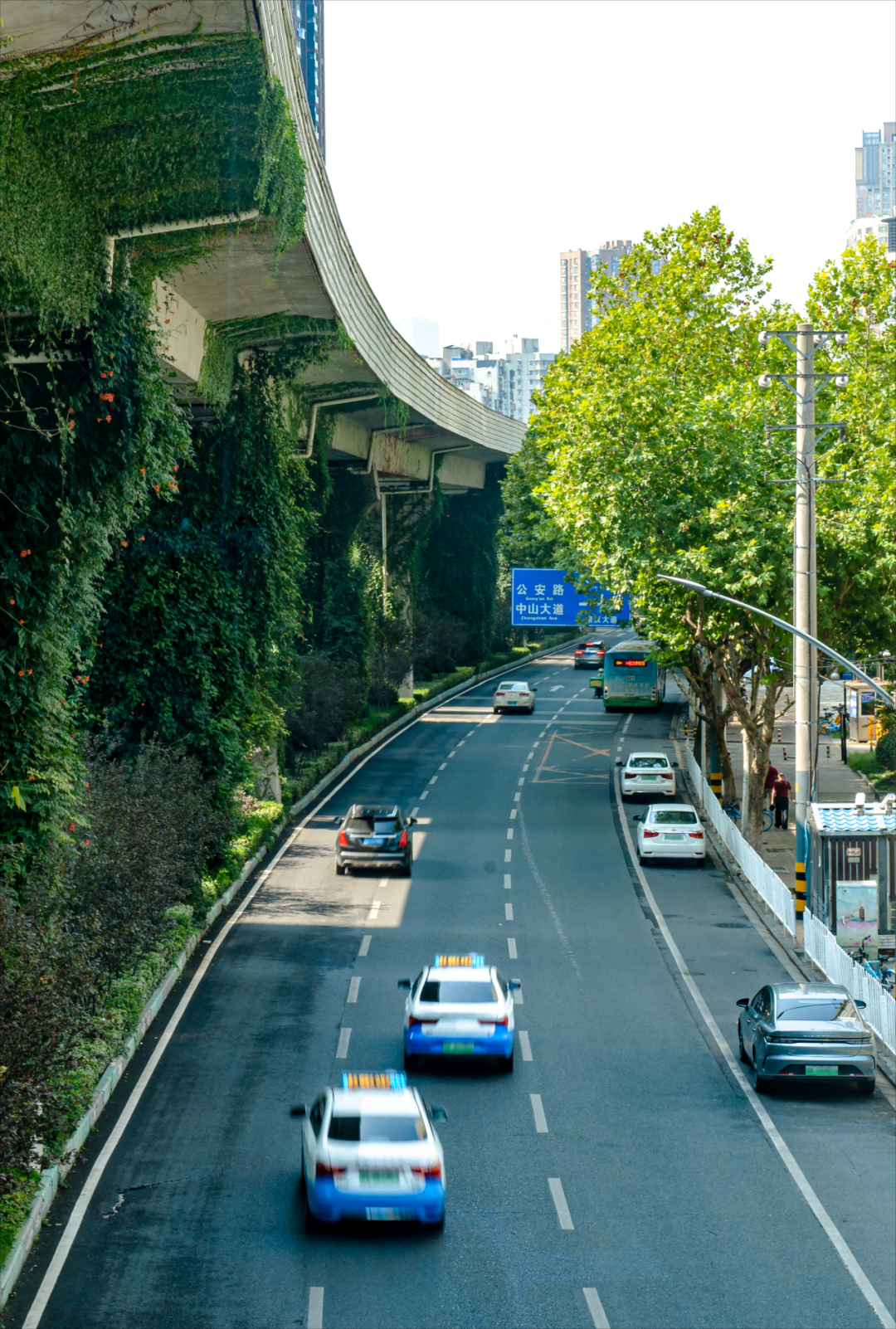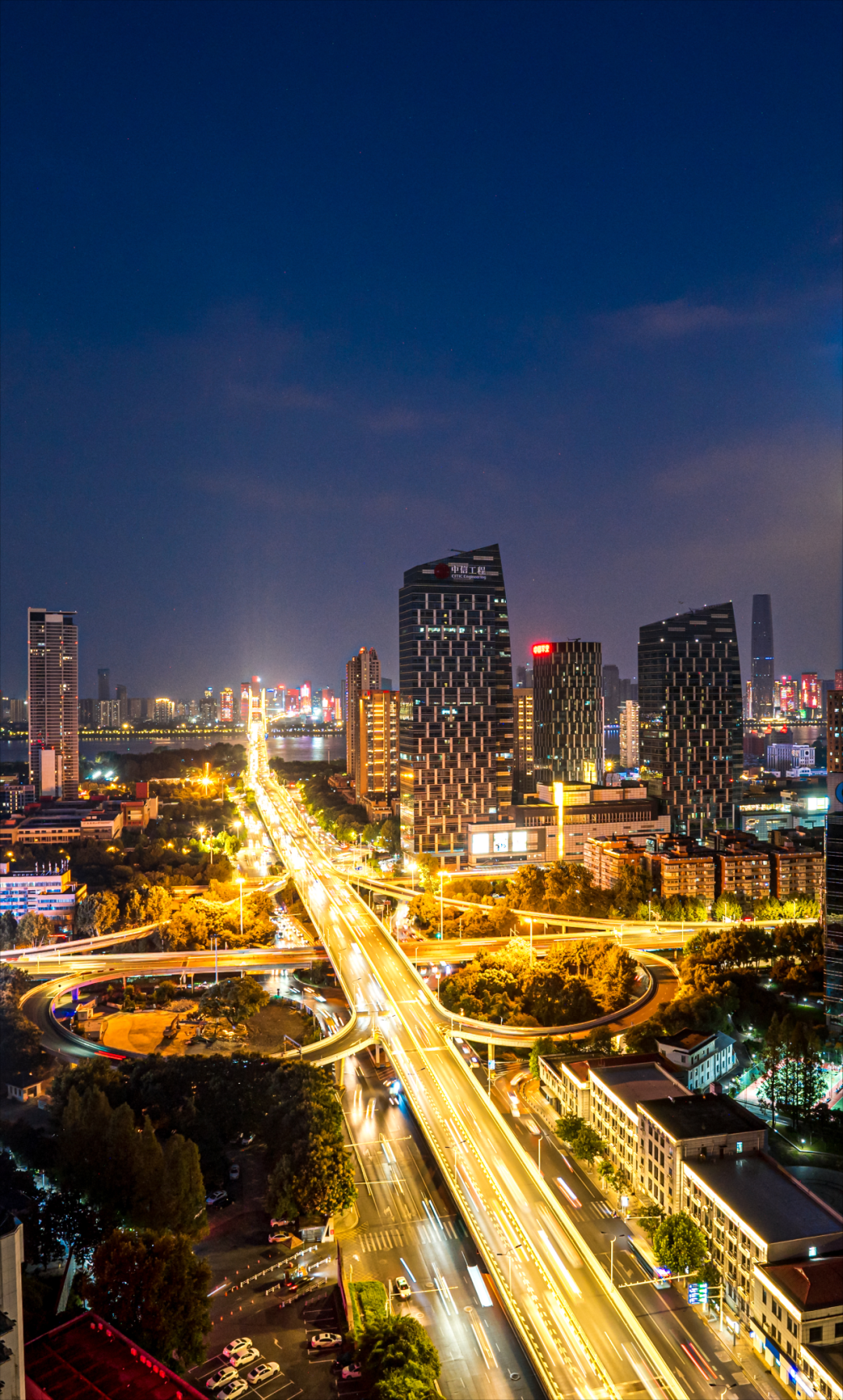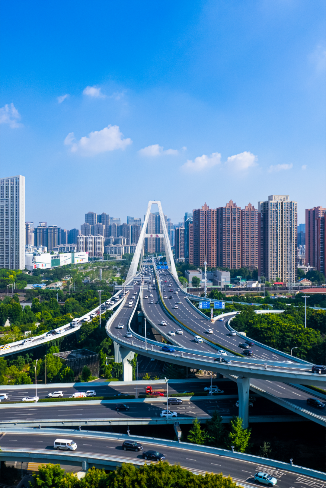 城市的经济发展离不开立交桥,竹叶山立交桥俯卧在江岸,默默地撑起车水马龙。在这里,扁平的交通变得立体,空间内的车流无需再等待红绿灯,大大增加通行效率,加快每一位城市奋斗者的逐梦速度。