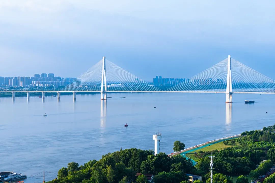 远眺二七长江大桥,百亩花海簇拥,竖立的牌匾高耸,直入云霄,斜拉索像是展开的巨伞。二七长江大桥横卧长江之上,气势如虹,矗立的三塔则寓意着武汉“三镇”。