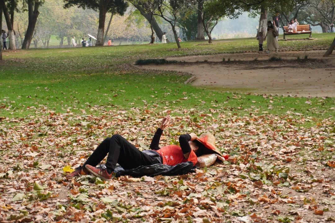 更有随心所欲者,在阳光稍微热烈时,会脱下外套,就地而躺。目光所及是五彩斑斓的秋色,抬头是满眼的治愈蓝,享受无比的自由与畅快。