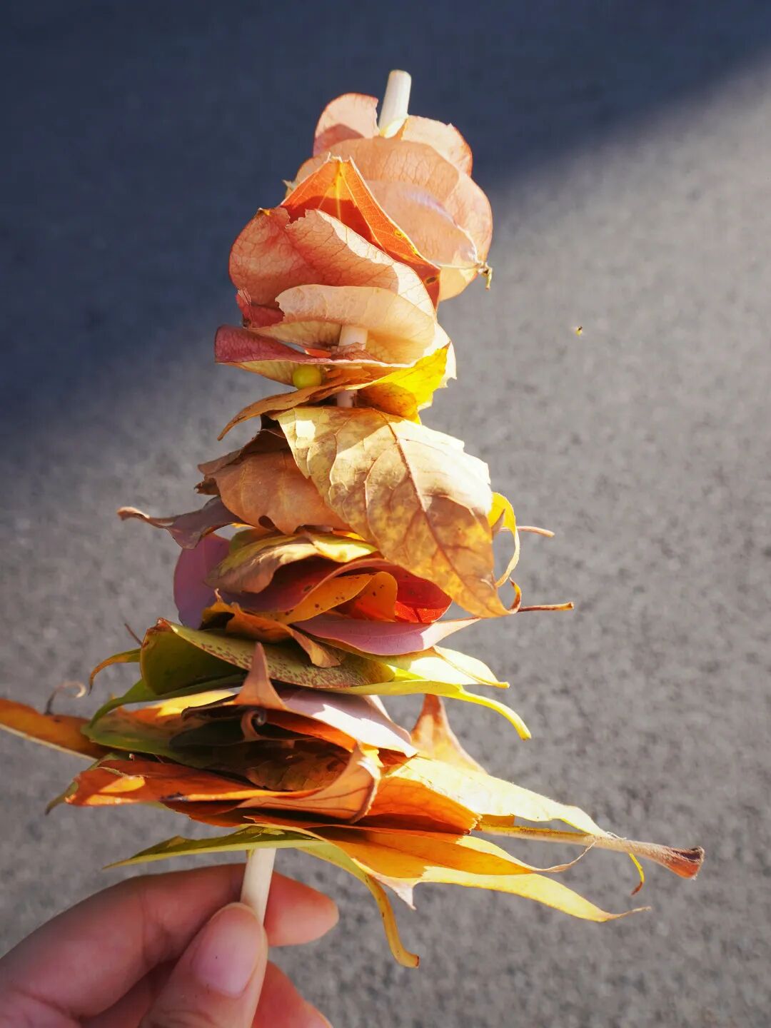 手里拿着一串落叶做成的“烤串”,满脸笑容的小姑娘得意地向朋友们展示着自己的佳作。