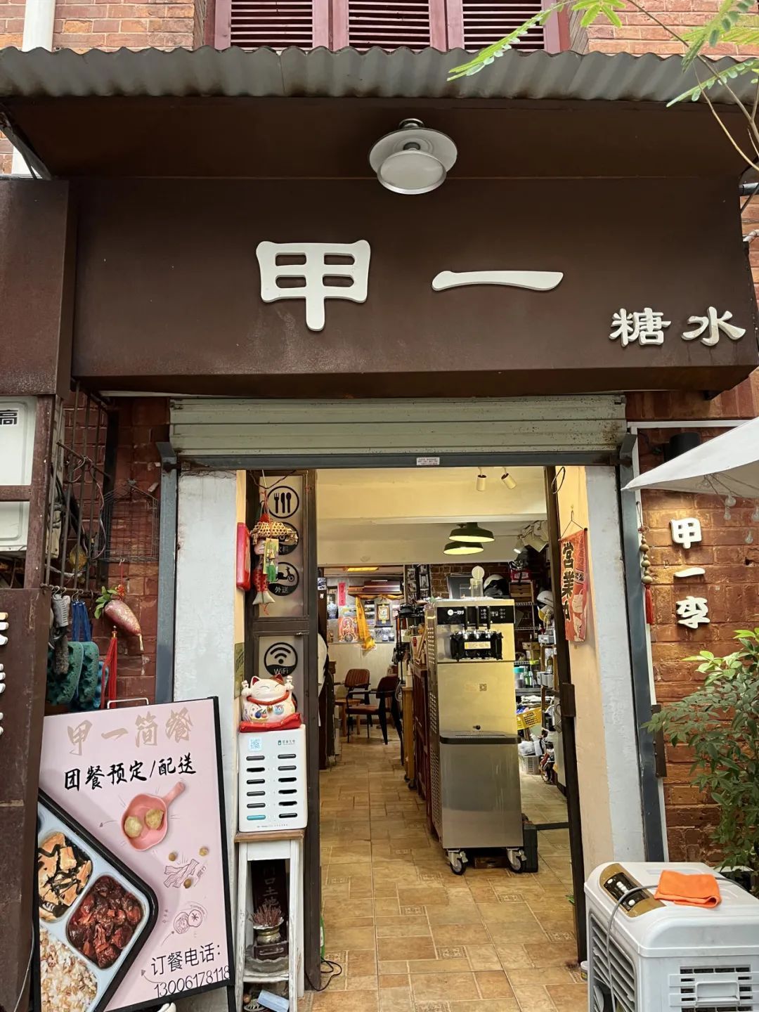 傍晚时候,闪烁的灯串逐渐亮起,星星点点撒在红色砖房,制造出焦糖色般的浪漫气息。甲一糖水挤在这条街的中间,极不起眼,却是许多人的宝藏店铺。