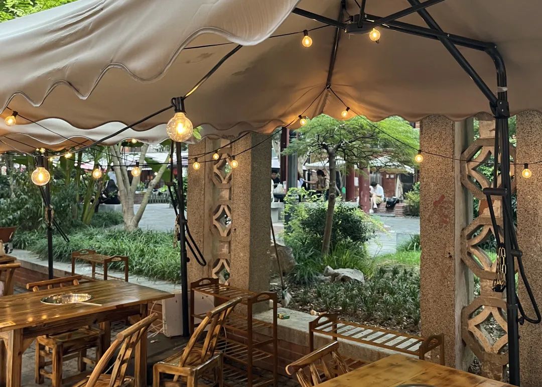 久经年岁洗礼的珞园像个上了年纪的贵妇人,立于珞珈山街上,园子中央的凉亭石桌,是街坊和路人的共享餐桌,好看的地方总是惹人留恋,“珞园幸福树”用叶子挡住喧嚣,与热闹拉开距离,制造了一场茂密的夜。