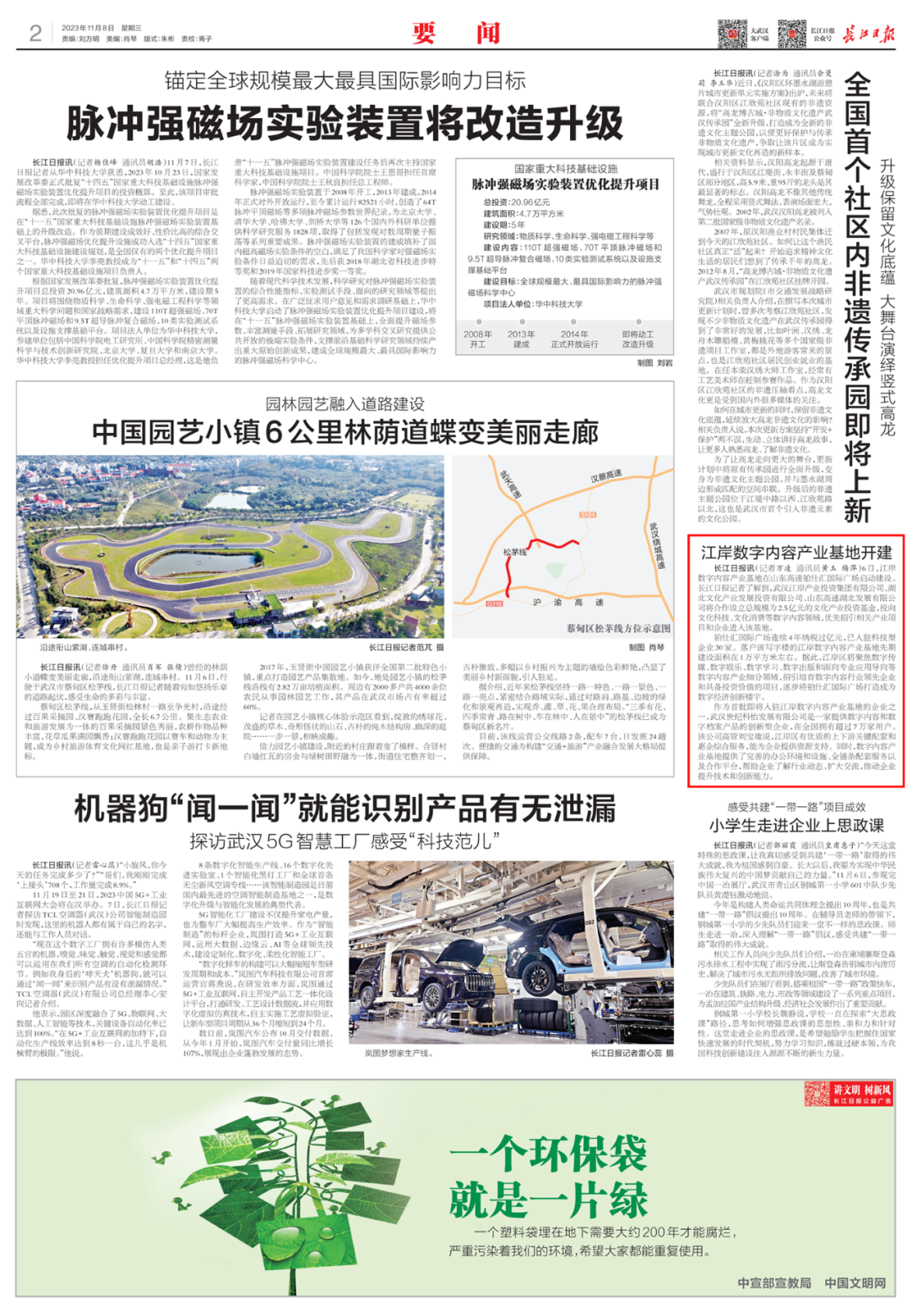 11月8日,《长江日报》要闻版报道江岸数字内容产业基地启动建设,将设立总规模为2.5亿元的文化产业投资基金,招投“文化+数字”类项目,全力开拓数字经济新赛道。