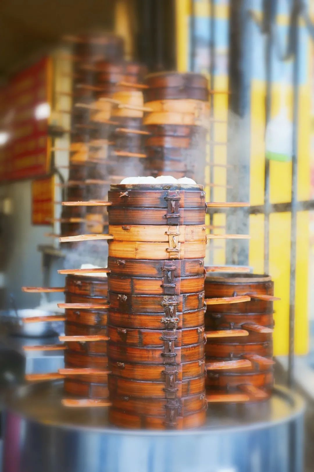 层层摞起来的蒸笼,在日复一日的高温熏染下早已褪去最初的色调,沉淀地如栗子色般,在升起的缕缕烟火气下更显得温暖。