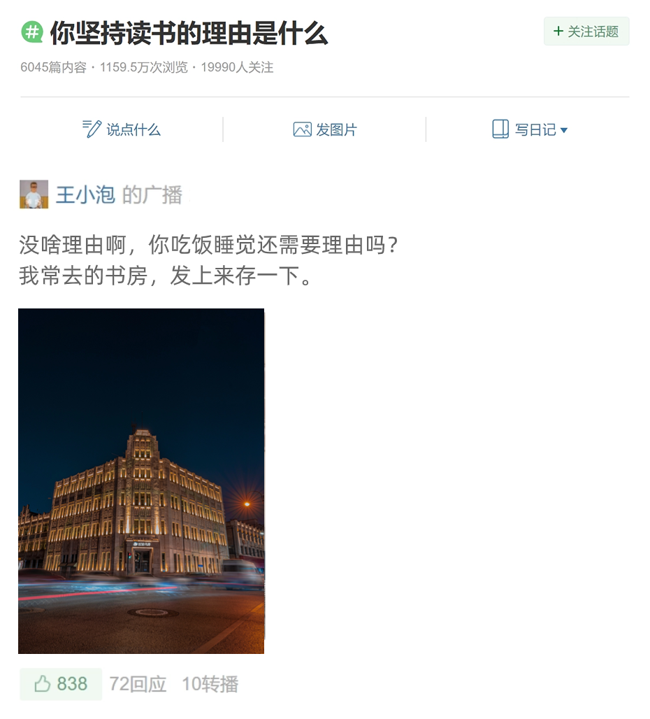 豆瓣上曾有一个热门话题:“你坚持读书的理由是什么?”