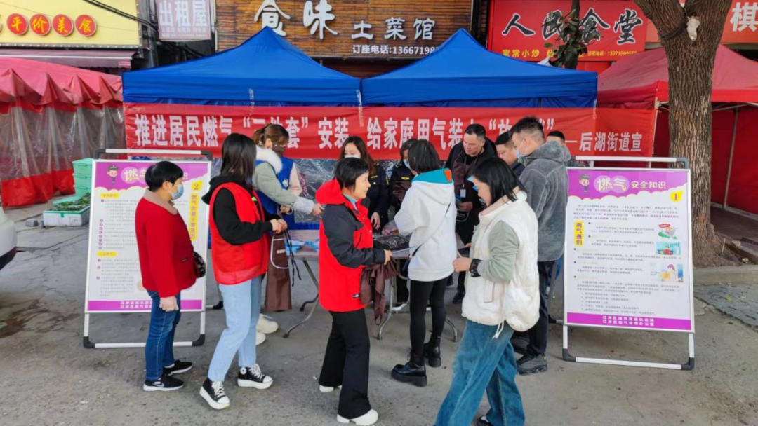 后湖街道组织公共管理办、建设新村社区、金宏燃气供应站点、燃气“三件套”专业安装公司工作人员、志愿者开展居民燃气“三件套”安装宣传活动。活动现场,工作人员向居民详细介绍了燃气“三件套”对于保障用气安全的重要性,并发放燃气安全知识宣传册和小礼品,提高居民燃气安全意识。