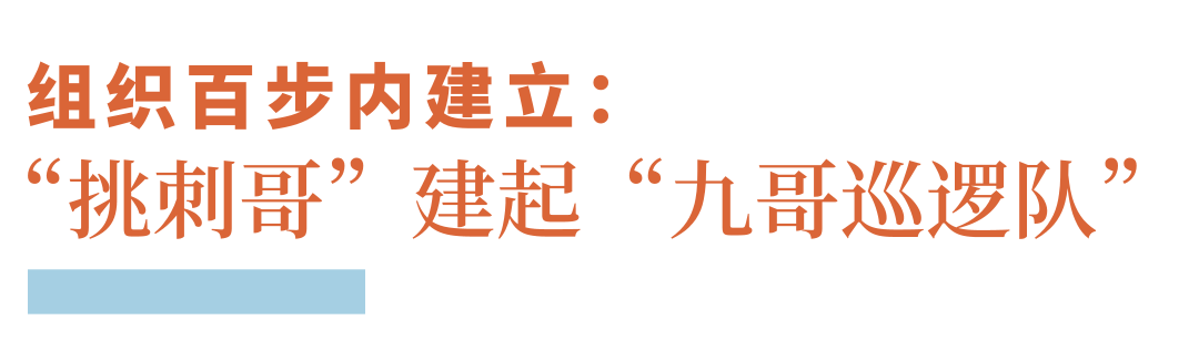 平日里,大到协助警方破案,小到调解邻里纠纷,哪类社区警情较为突出,哪些楼栋存在“飞线”充电,哪些路段路灯损坏了,甚至树枝折断了等等,凡与社区平安和谐息息相关的事情,都是“九哥”们时刻放在心上的要事。