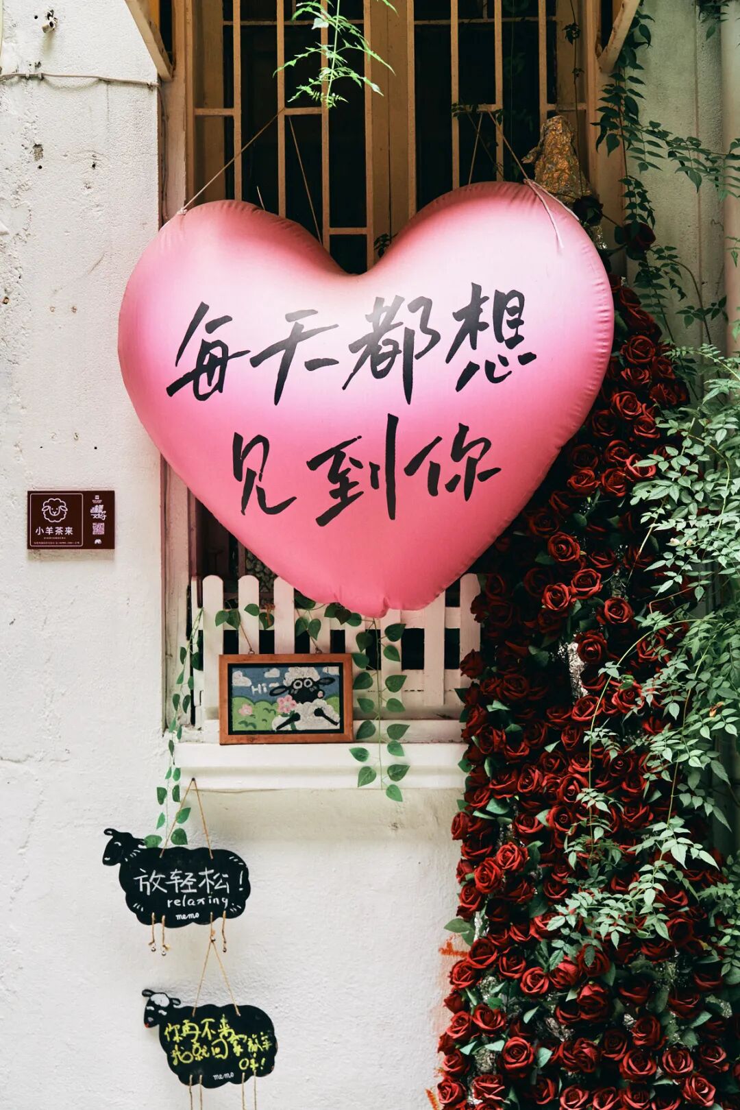 玫瑰花瀑布点缀在粉嫩爱心气球旁,对路人诉说“每天都想见到你”,很难让人不心动。