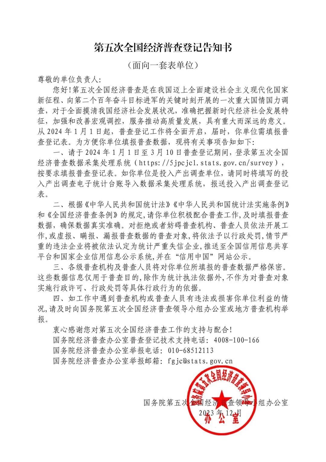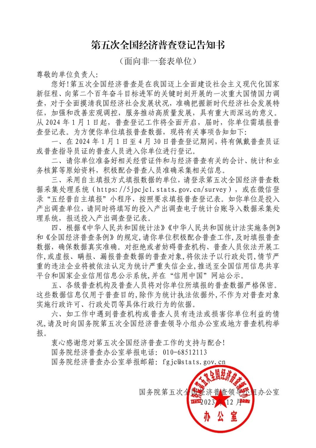 国务院第五次全国经济普查领导小组办公室日前印发《关于开展第五次全国经济普查登记告知工作的通知》。