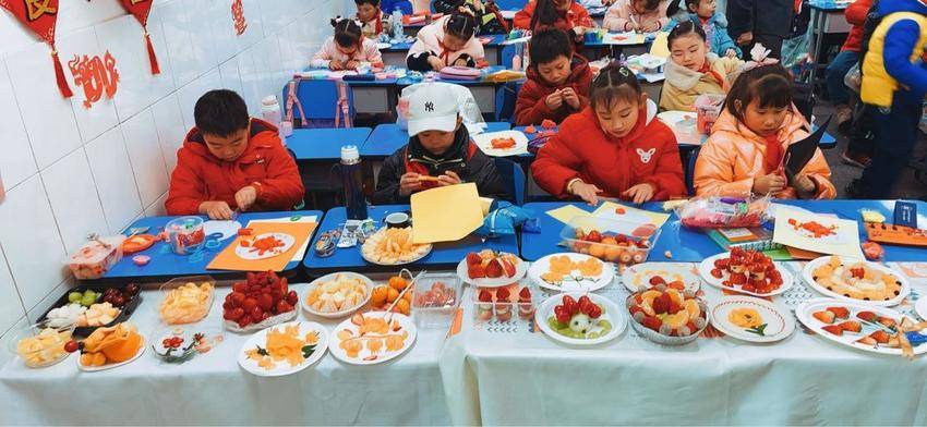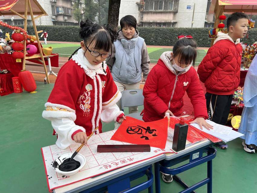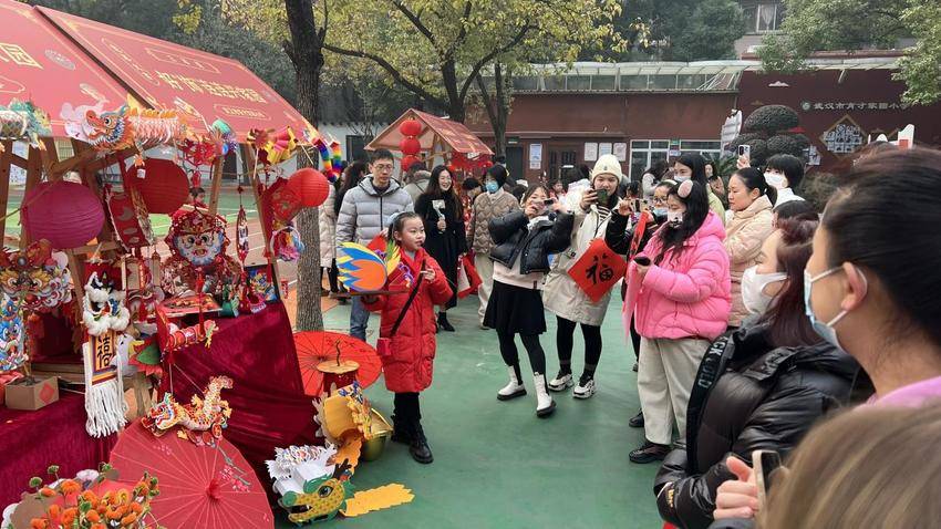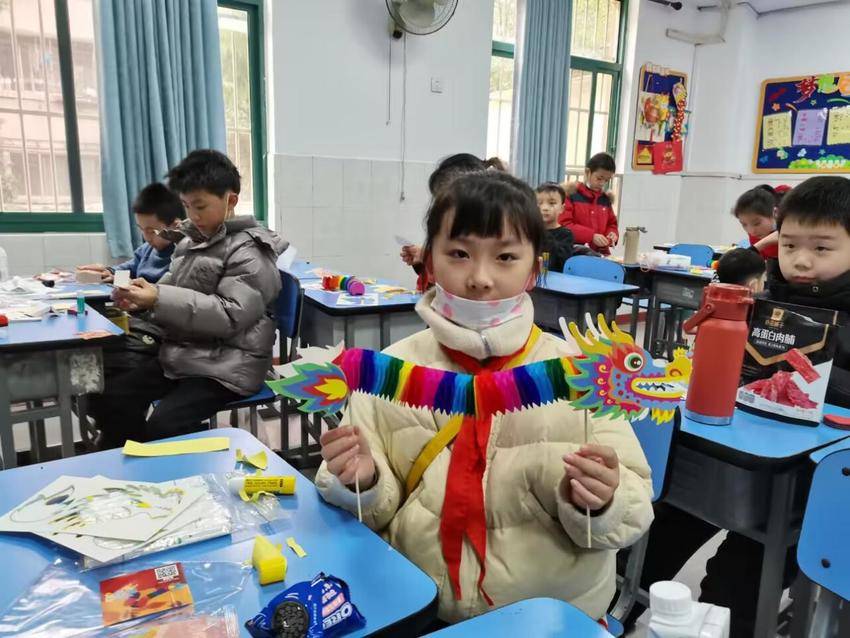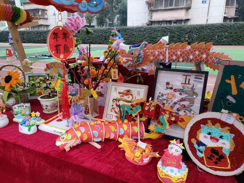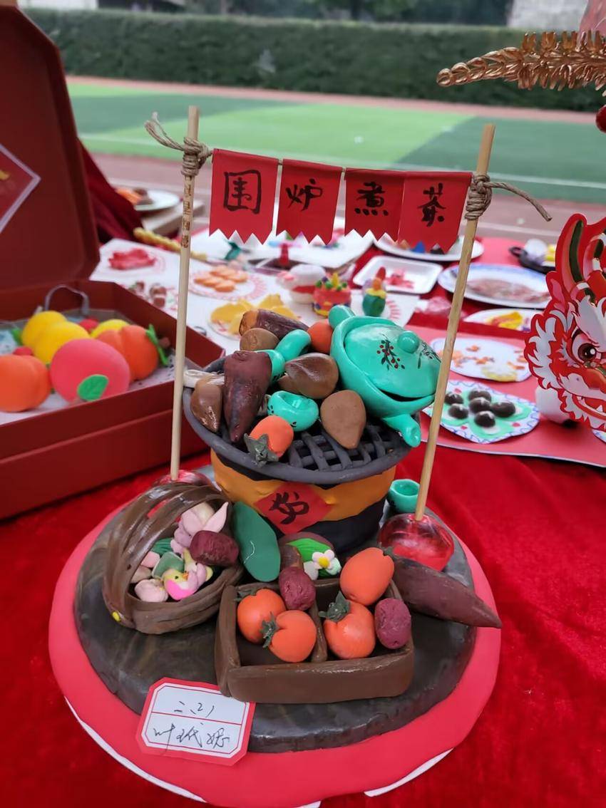 操场上红红火火热气腾腾,年俗作品展台格外吸睛。“食”运满满聚家园、好“饰”连连兴家园、辰龙“挂”帅旺家园、神龙“摆”首耀家园、我们福慧华“光”熠家园……一个年级一个主题,学生们用不同环保材料制作了年历、年卡、龙灯,还有一桌桌泥塑团年饭……瞧,传统菜系、花样火锅让人食欲满满,神龙摆尾活灵活现,各种各样的年俗手作,扮靓了家园。