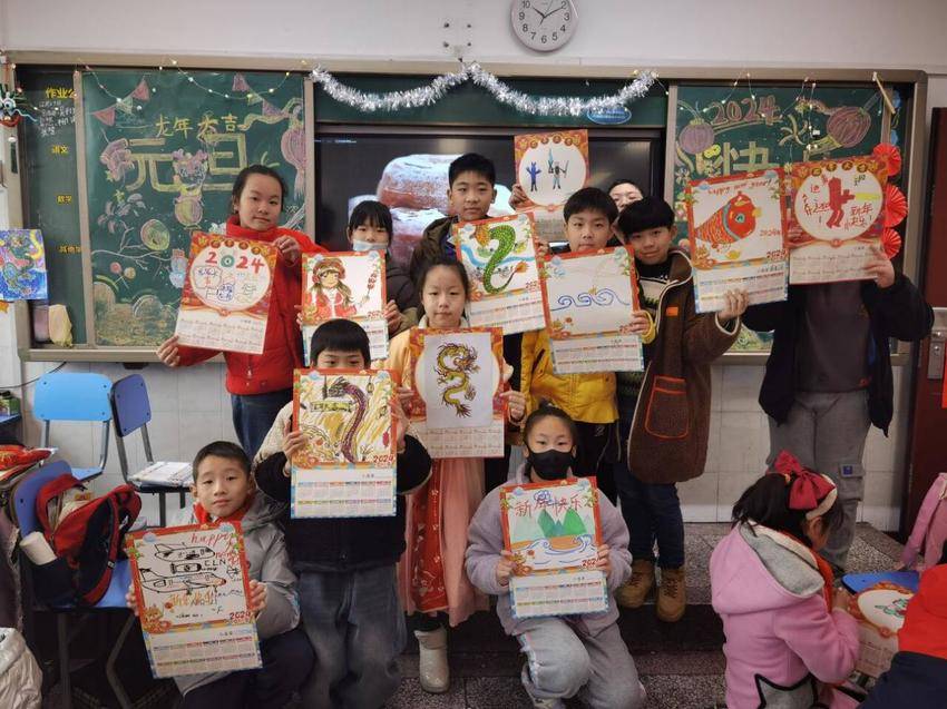 特别是毕业年级学生,制作的年历、台历,有回顾六年校园生活的图片,有老师的毕业寄语,有相互的新年祝福,六(9)班于依泳说:“我知道了“争做‘龙的传人’,需要有好的品质和习惯,时光匆匆,只争朝夕。”