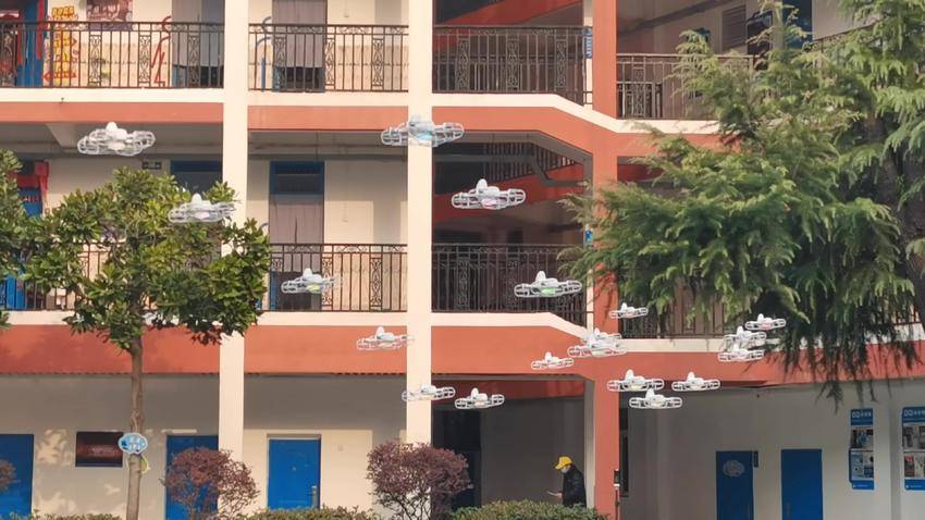 活动现场,无人机排着整齐的队伍入场,时而变换队列,时而翻着跟头,引得同学们连连惊呼,掌声不断。