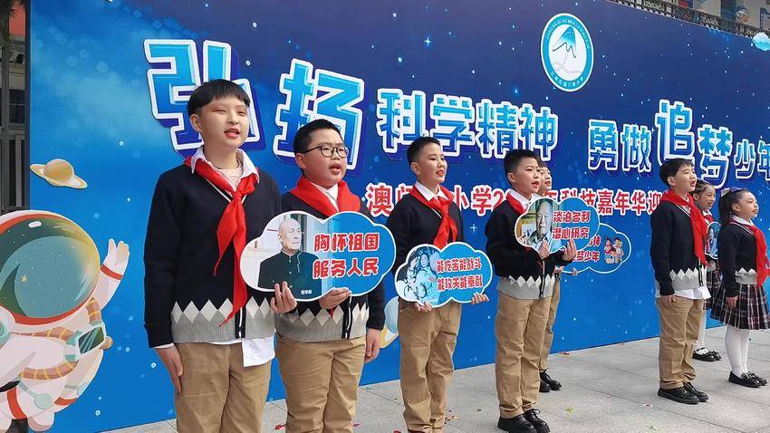 据澳门路小学相关负责人介绍,澳门路小学一直以科学家精神为指引,在教育的“双减”实践中做好科技教育的加法,学校新建了科学家名人墙,班级以科学家命名,学校老师还特意为本届科技嘉年华,创作了主题诗歌《弘扬科学精神 勇做追梦少年》,并由学生进行表演诵,鼓励孩子们学习科学知识,探索科学奥秘,做勇敢的追梦少年。