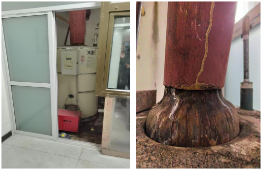 1号锅炉安装在一层西侧一房间内,2号锅炉安装在一层楼梯间内,使用天然气作为燃料。两台锅炉房均安装了推拉门,锅炉运行时推拉门处于关闭状态。两台锅炉的烟道及烟囱均为碳钢材质,锅炉烟气出口与管道连接处未进行焊接密封处理,采用直径0.2米的钢管直接套在锅炉烟气出口,接口处有明显缝隙。