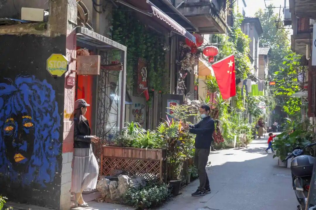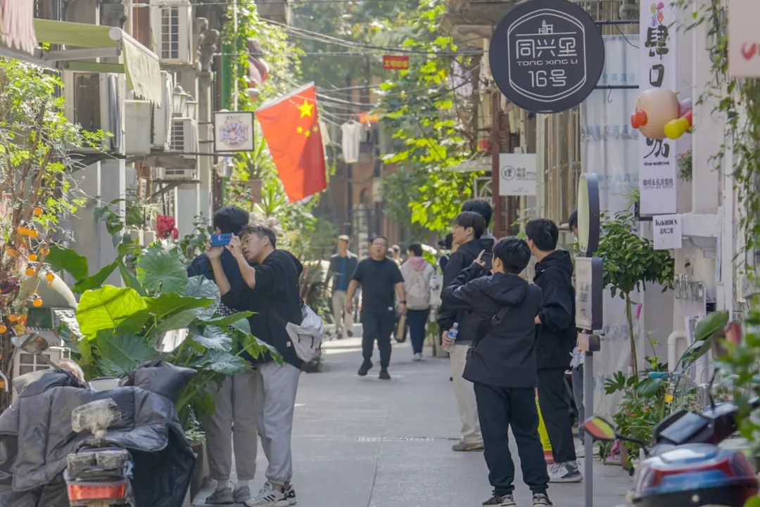 晾晒的衣服,饭菜的香味和居民楼里新闻联播的声音,让一切都慢下来,心没由来地感到些许的雀跃。摆弄花草的老人与打卡拍照的年轻人互不打扰,新鲜的色彩流淌进老里份,奇妙地融合在一起。