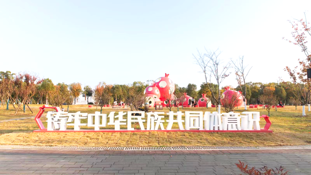 走进占地面积约1.7万平方米的“江岸石榴红”主题园区,能看到中国地图、石榴籽等寓意民族团结的文化符号点缀江滩,不少亲子家庭在以石榴籽为造型的景观装置前打卡拍照。