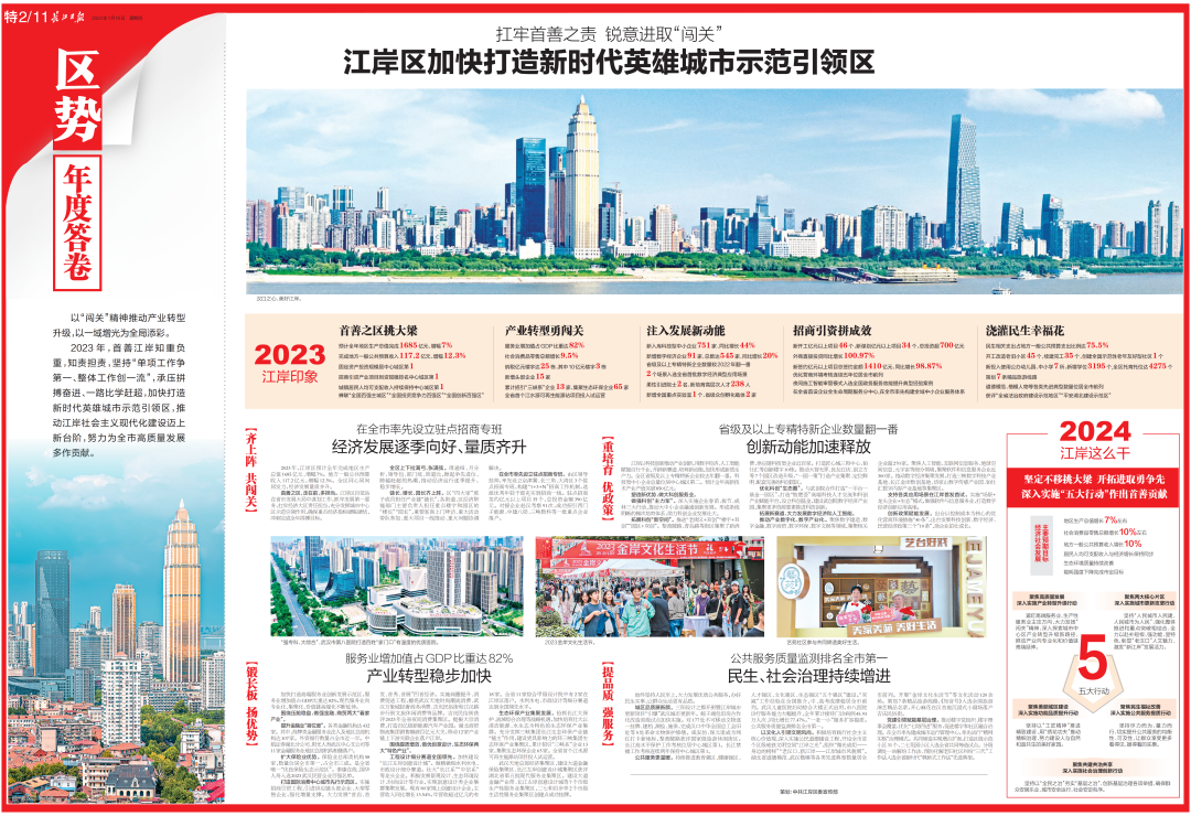 2023年,首善江岸知重负重,知责担责,坚持“单项工作争第一、整体工作创一流”,承压拼搏奋进、一路比学赶超,加快打造新时代英雄城市示范引领区,推动江岸社会主义现代化建设迈上新台阶,努力为全市高质量发展多作贡献。