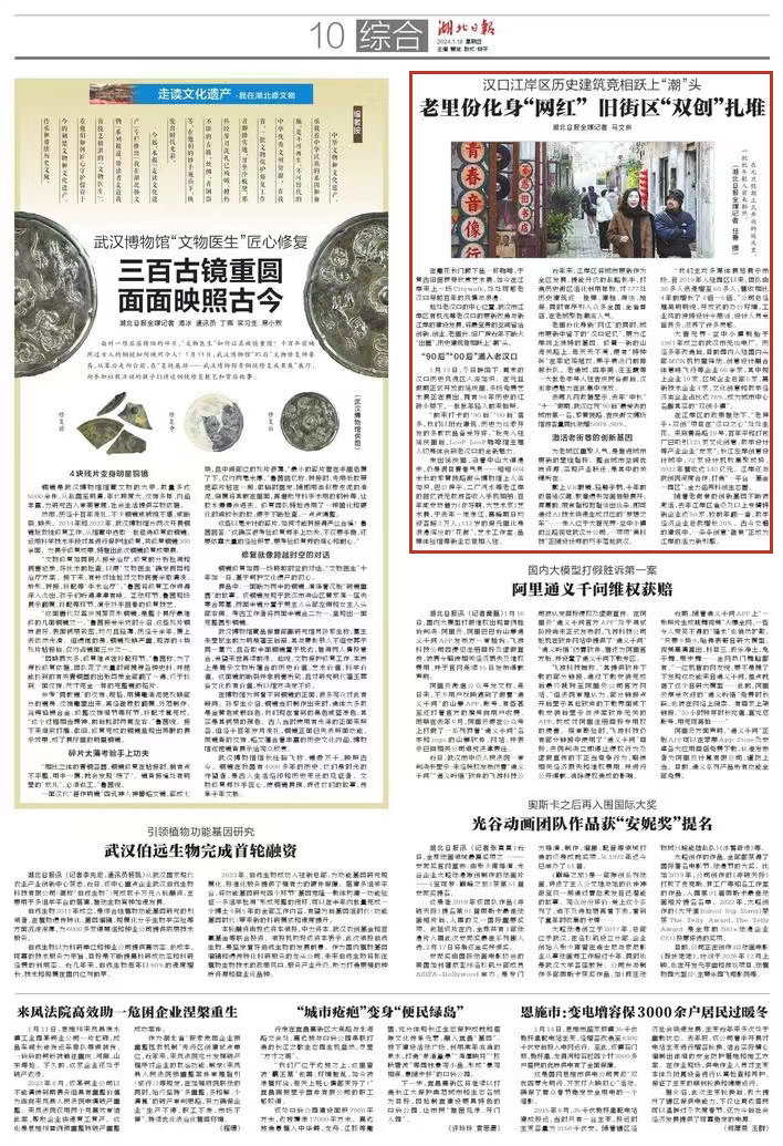 1月18日,《湖北日报》报道江岸区有机统筹老汉口的更新改造与新江岸的建设发展,将最宝贵的空间留给创新、创业,老里份、旧厂房近年不断火“出圈”,历史建筑竞相跃上“潮”头。全文如下: