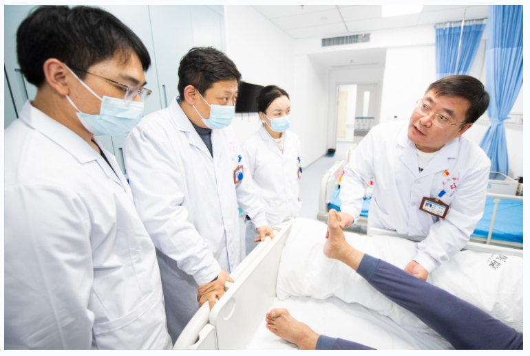 ● 康复医学科负责人张伟和科室成员一起检查患者康复情况