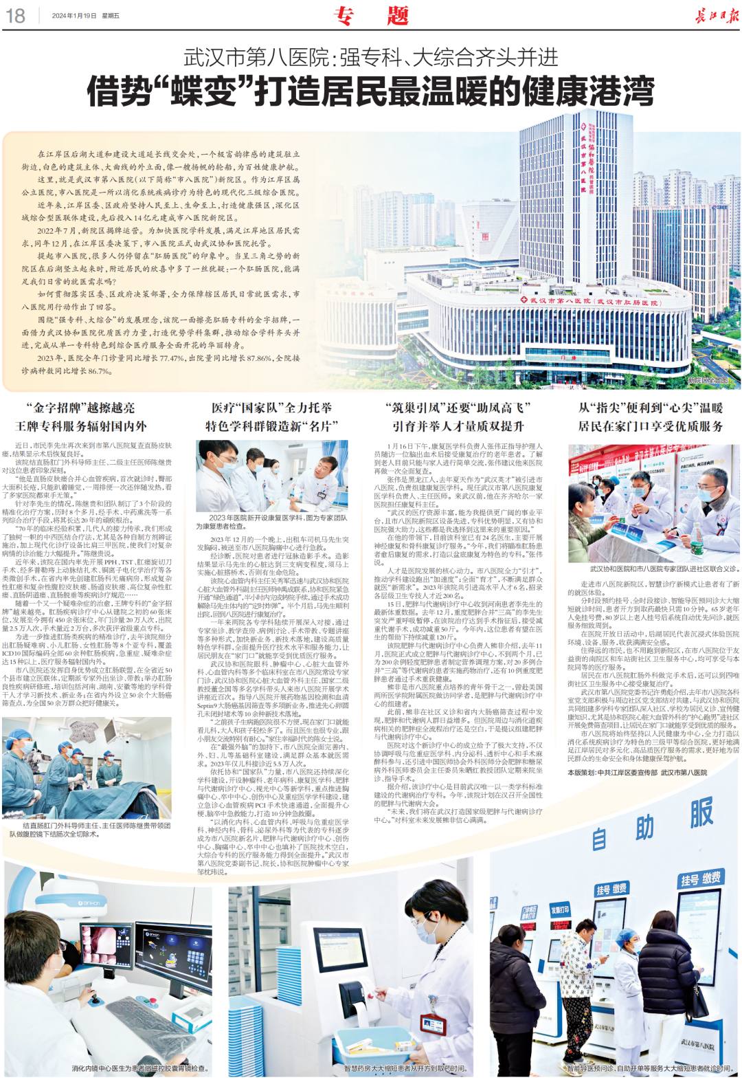 1月19日,《长江日报》整版报道:武汉市第八医院强专科、大综合齐头并进,借势“蝶变”打造居民最温暖的健康港湾。全文如下: