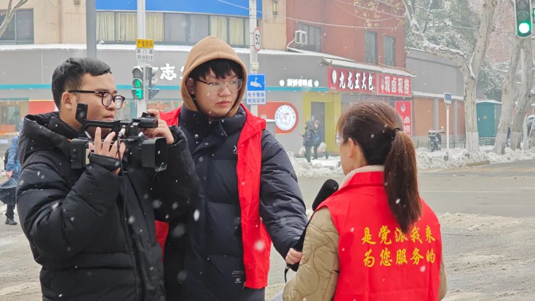 在除雪除冰的同时,他始终牢记记者使命。扫完一段路,就扛起摄影机,将镜头对准现场,记录最真的画面。