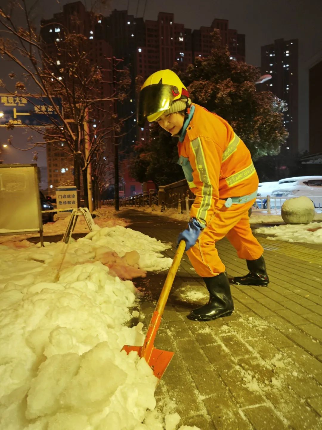 铲雪、在人行道上铺草垫、在冰上撒盐......累了就地歇一会,喘口气,困了就在附近单位站点小咪一下,大家换着班轮流去。
