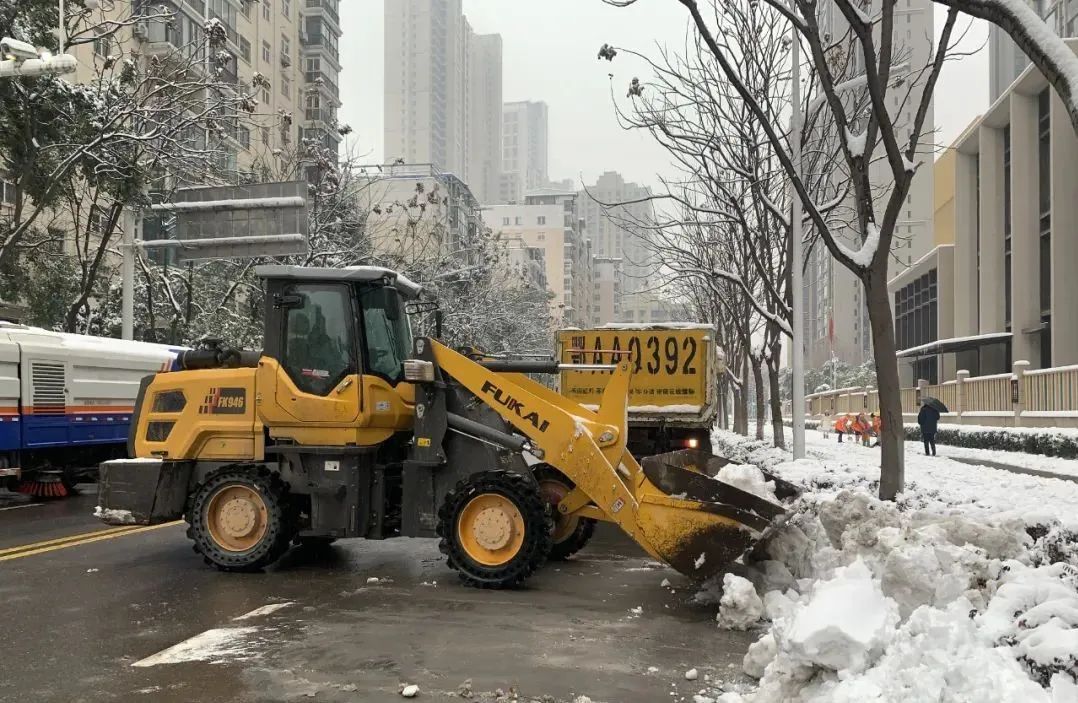 江岸环卫人员用铲车将路边积雪转运至运输车