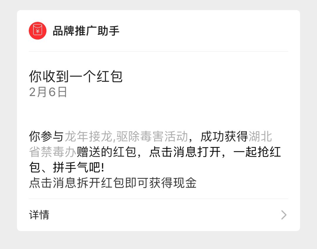 ● 中奖后,将会收到由微信【服务通知】发来的名为“你收到一个红包”的推送消息,点击消息拆开红包即可获得现金。