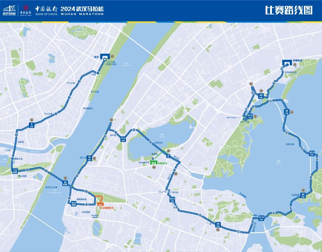 半程马拉松(21.0975公里),参赛人数为10000人,终点为湖北省图书馆;