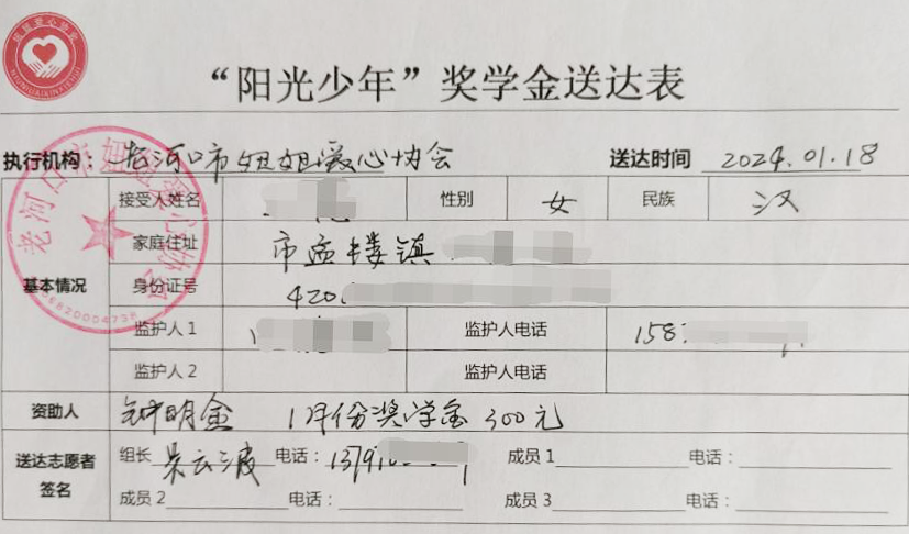 通过朋友介绍,钟明金进入了协会QQ群,就此见到了第一个自己长期资助的孩子——小蕙。此后,钟明金每月定点向协会账上汇去300元,这笔以“奖学金”名义发放的资助款伴随着小蕙从小学、初中、高中一直延伸到了大学,从未间断。