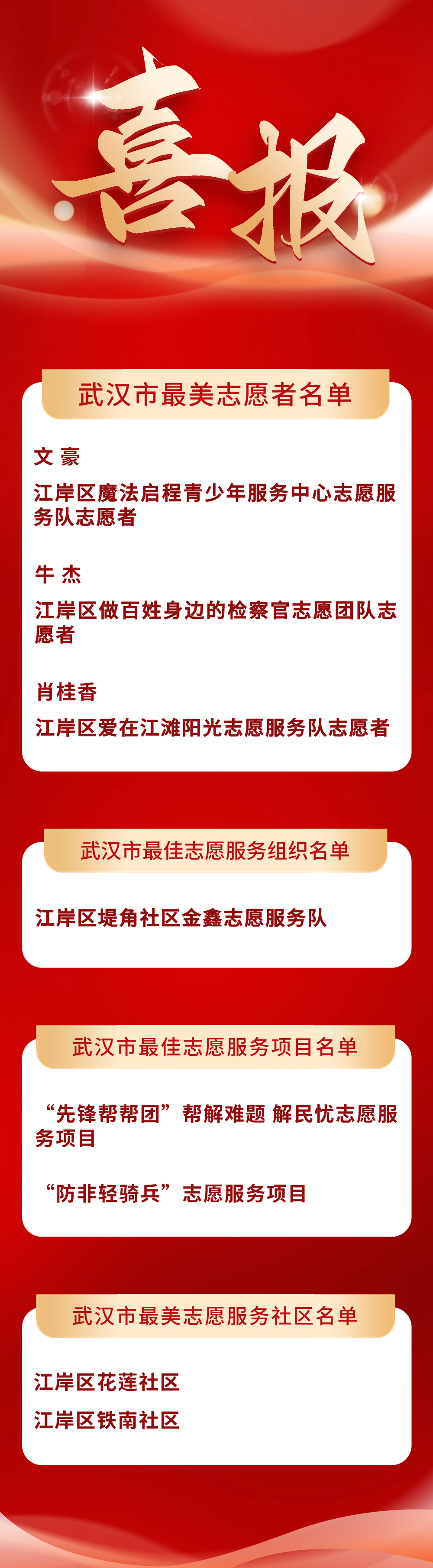 此外,武汉市文明办会同有关部门开展了2023年度全市学雷锋志愿服务“四个一批”先进典型宣传推选活动,江岸区3个最美志愿者、1个最佳志愿服务组织、2个最佳志厦服务项目、2个最美志愿服务社区上榜。