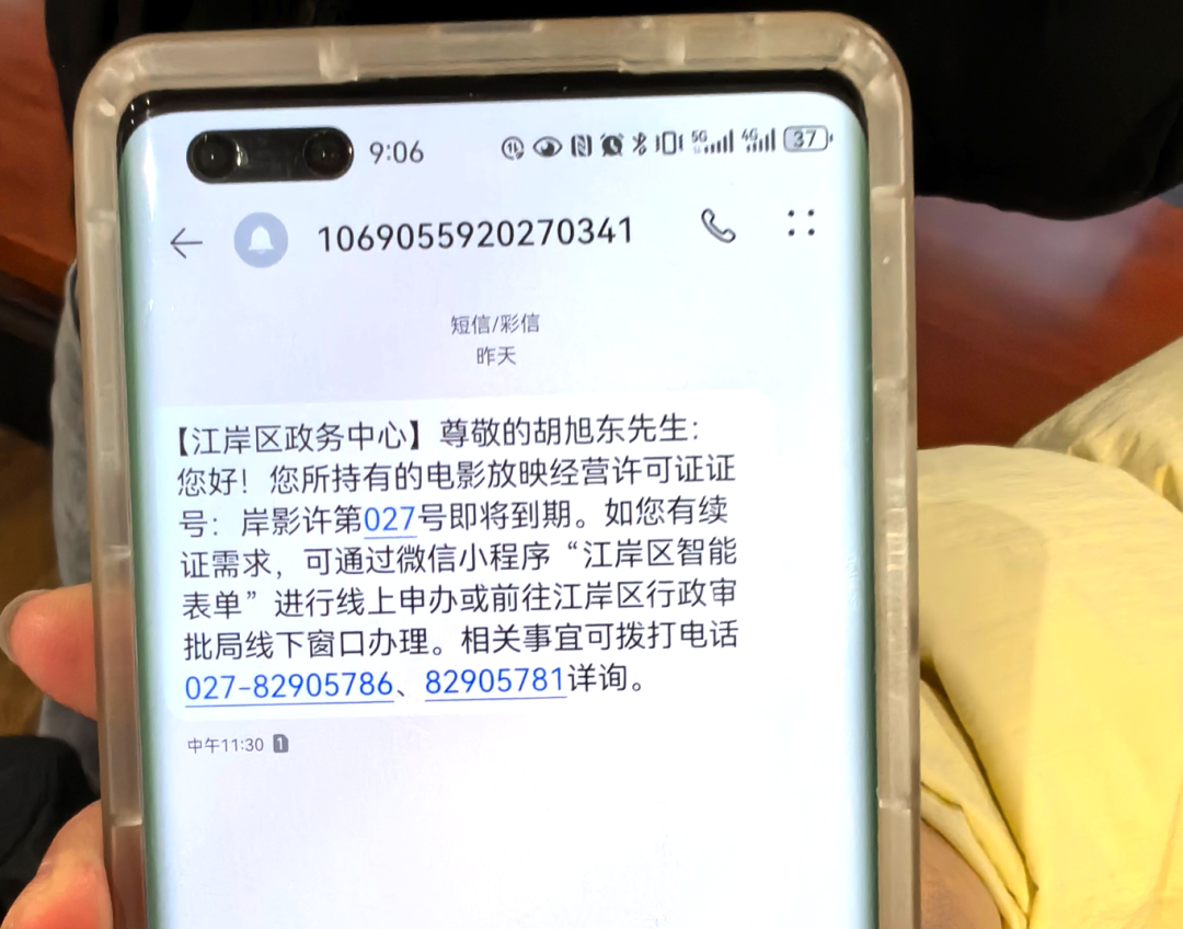 “幸好收到了政务中心的短信提醒,不然许可证过期了,会影响我们正常经营。”3月4日,胡先生在收到区政务中心的短信提醒后,体验了“江岸区智能表单”微信小程序新上线的证照延续“无感智办”功能,在线办理了电影放映经营许可证延续换证。