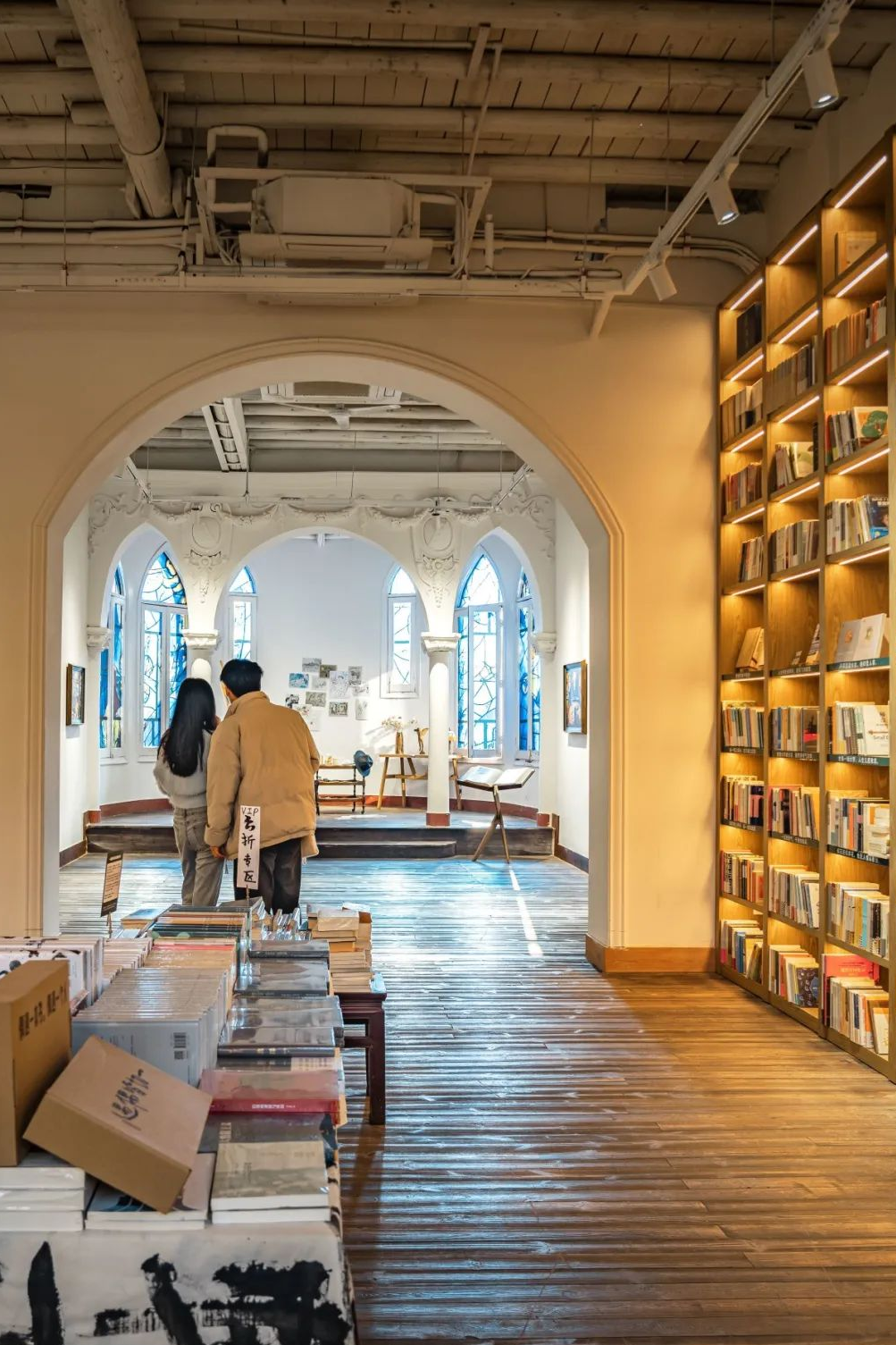 导航到江岸区胜利街207号,可见到一座古典的西式教堂,这里保留着百年前的爱奥尼式立柱与拱顶,繁复精美得引人赞叹。却让人不犹疑问,书店在哪儿?其实只需迈进这幢建于20世纪30年代的三层洋房,沿着咯吱咯吱的旋转木梯向上便是一蓑书店。